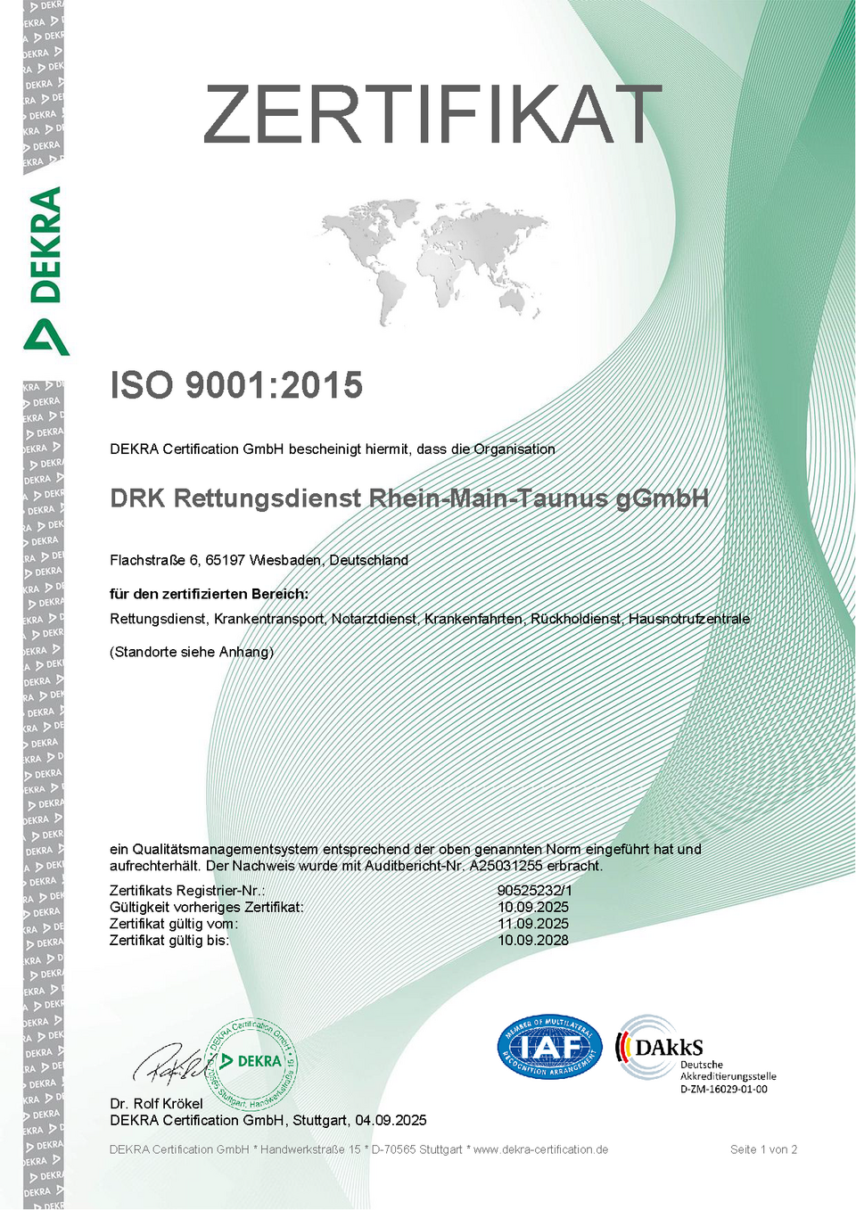 Seit September 2004 ist unser Qualitätsmanagementsystem, welches flächendeckend an allen Rettungsdienststandorten und in allen Unternehmensbereichen eingeführt worden ist, durchgängig gemäß DIN EN ISO 9001:2015 erfolgreich zertifiziert.